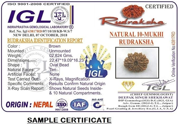 Ten mukhi Rudraksha represents lord Vishnu.The wearer of this Rudrakshs remains free of all the evil effects on inauspicious planets and all other evil spirits .This Rudraksha is helpful in all respiratory diseases if taken with milk in parts form. This is very helpful in chronic cough and asthama. Its wearer is protected from all type of attacks from weapons.The Dus Mukhi Rudraksha has immense benefits such as psychological, medical and many other general benefits. It helps the wearer to have strong will power, determination, courage, force, and ultimately it makes one energetic. It helps you to get rid of all sorts’ of evil energy and forces.This Rudraksha also provides protection to a person against any kind of Black Magic, Evil Eye etc. since it controls and eliminates all kinds of Evil beings. This Rudraksha pacifies all the 9 planets and it is also a very good tool to rectify Vastu faults of a place. Hence, the wearer of this Rudraksha is blessed by several Gods as well as he is protected from the harmful effects of all the 9 planets, Black Magic and Evil Eye.. Origin- Nepal. Lab Certificate- IGL Certified (Most Trusted Lab For Rudraksha Testing With Online Verification)