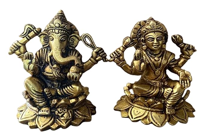 Exquisite Design: Intricately crafted brass idols of Lord Ganesha and Goddess Lakshmi, featuring exquisite detailing and a lustrous golden finish.